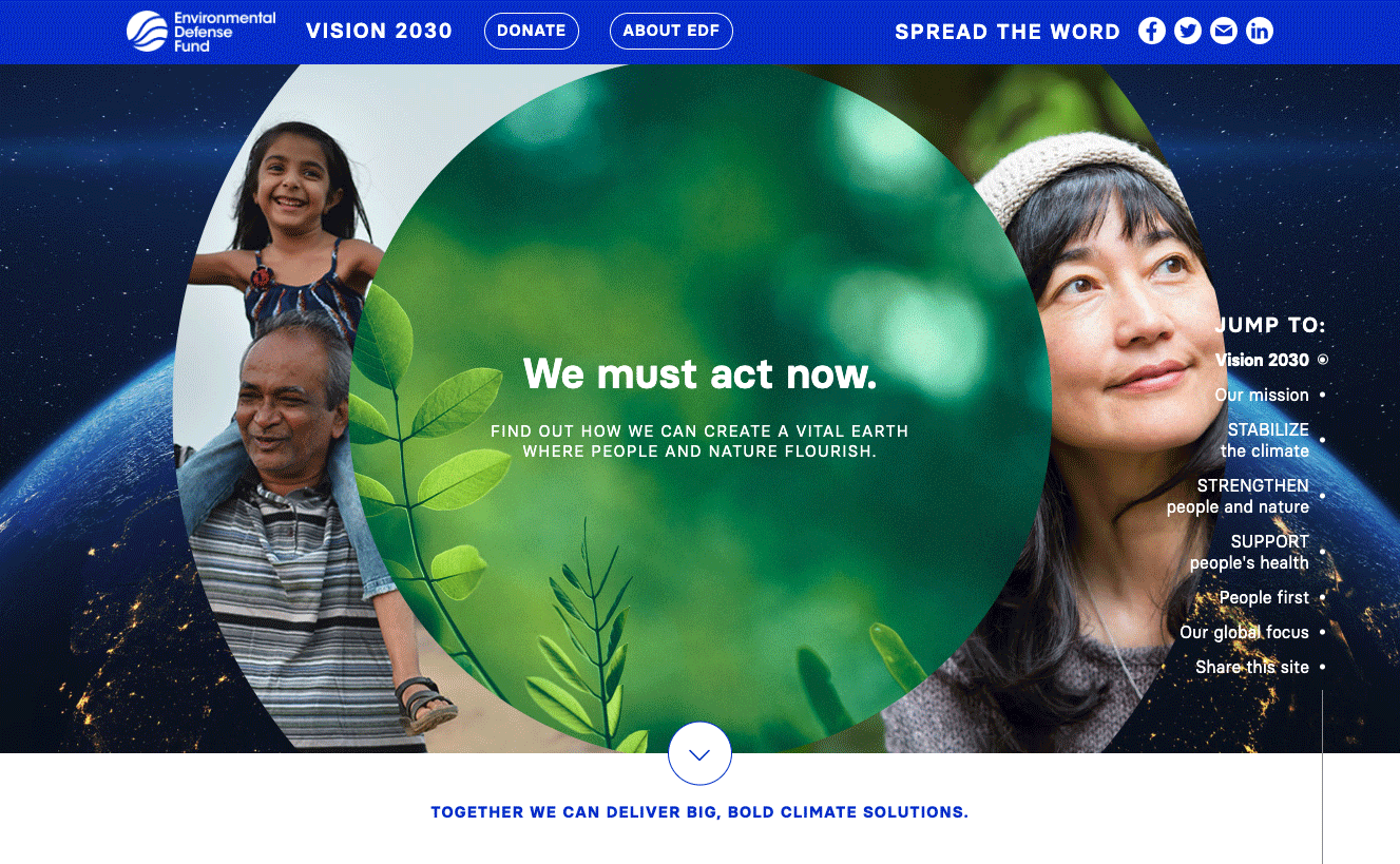 THE IDEA: Released annually, Environmental Defense Fund’s Vision 2030 (essentially their strategic plan) always had decent results in driving donations and attracting new supporters. Looking hard at the data on how visitors used the site, we constantly made improvements each year to meet the audience’s demands that the site deliver just the essential information quickly and easily.